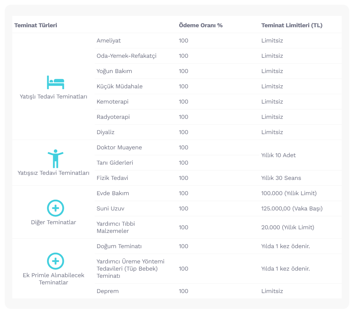 Bu teminat, SGK’nın tüp bebek tedavisi ödeme şartları doğrultusunda, 1 yıllık poliçe süresi boyunca geçerlidir.